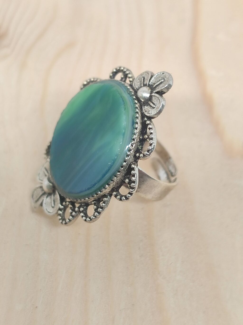 Δαχτυλίδι με γυαλί σε αποχρώσεις του πράσινου και ατσάλινη βάση με ρομαντικές λεπτομέρειες.