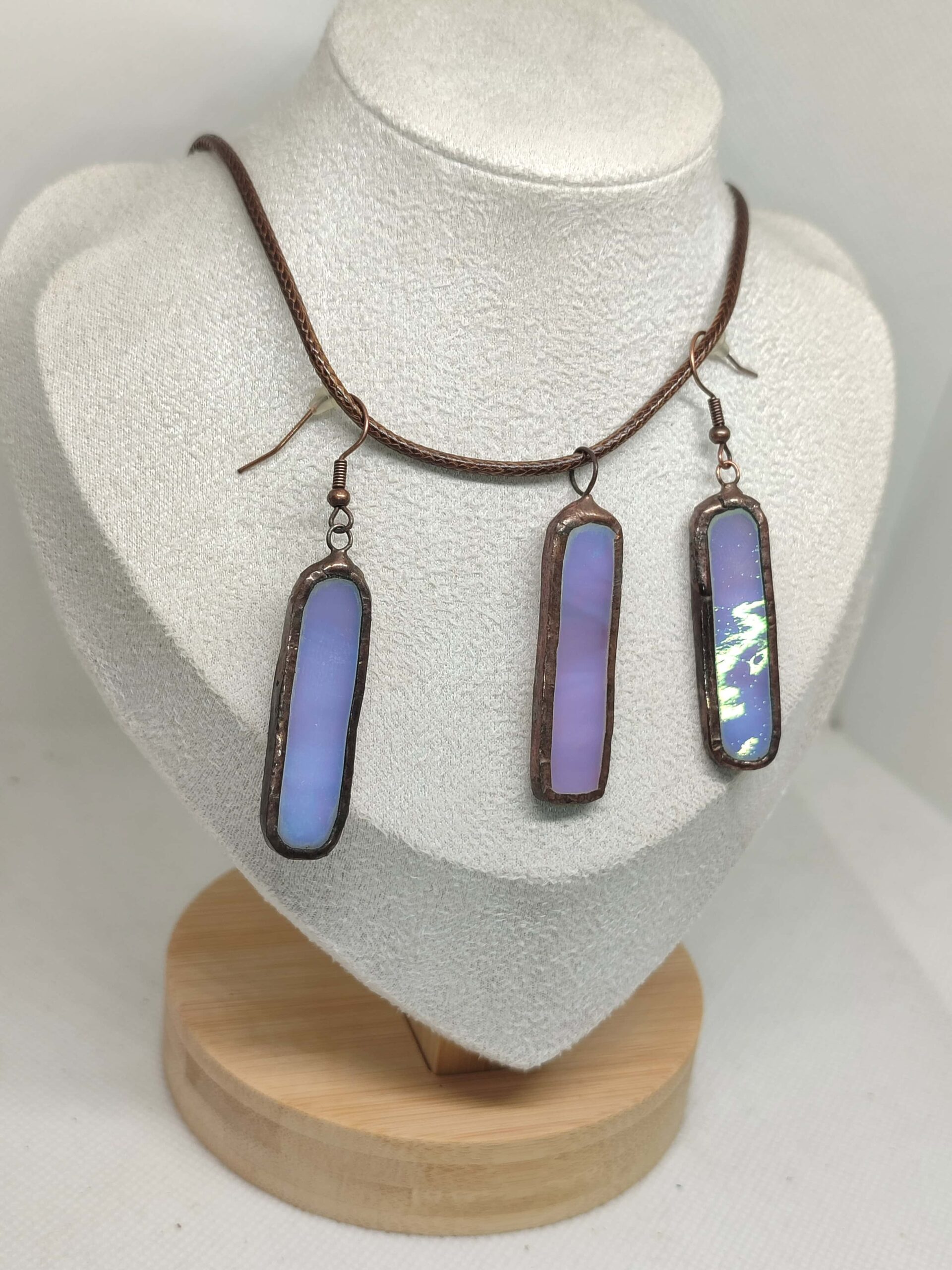 Χειροποίητο σετ μενταγιόν και σκουλαρίκια από ιριδίζον γυαλί βιτρό Tiffany’s.